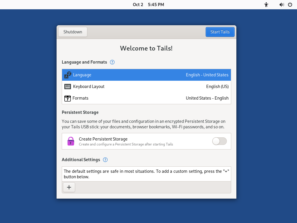A la Pantalla de Benvinguda, seleccioneu la llengua i la disposició del teclat a la secció Language and Formats. Feu clic a Inicia Tails.